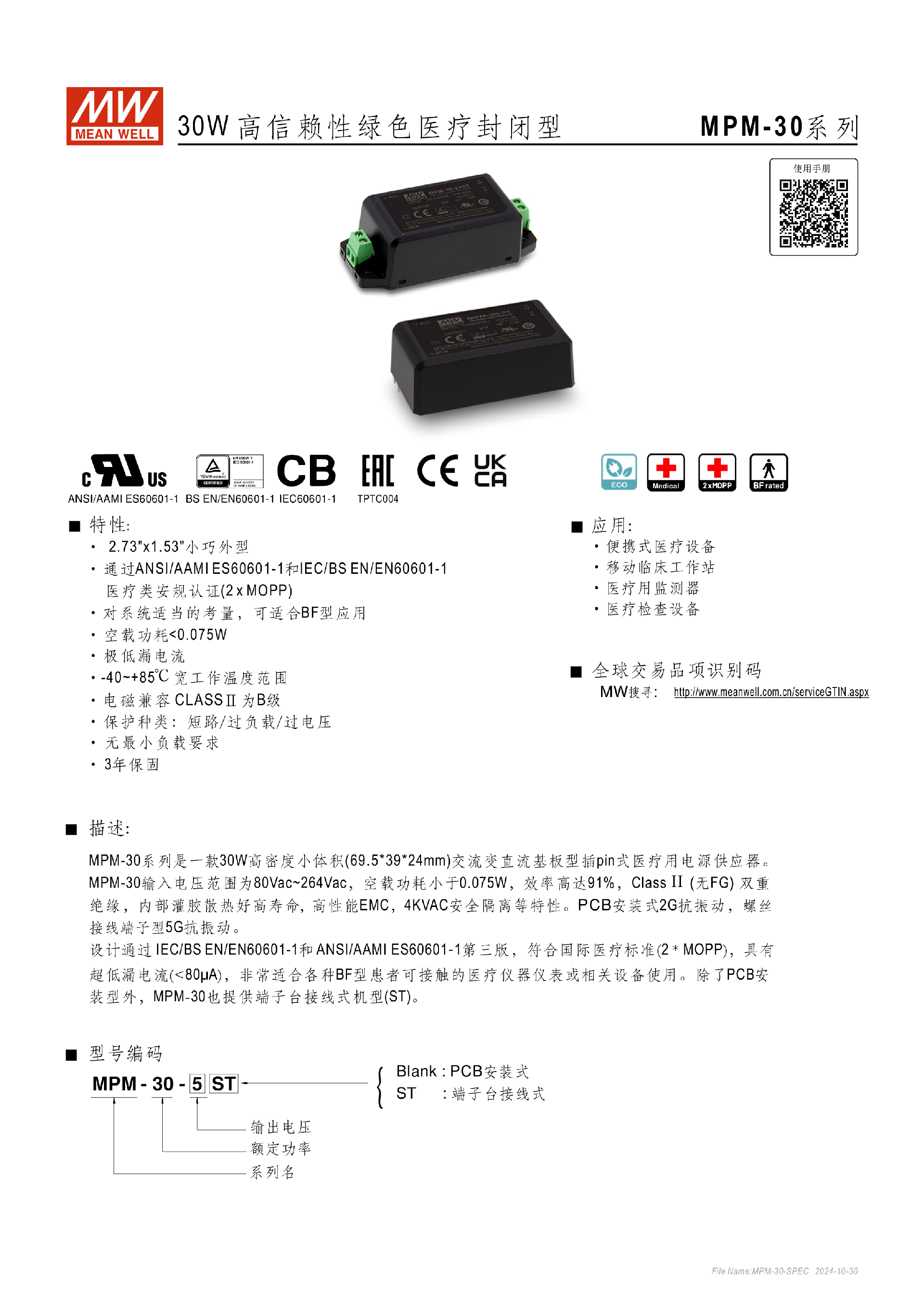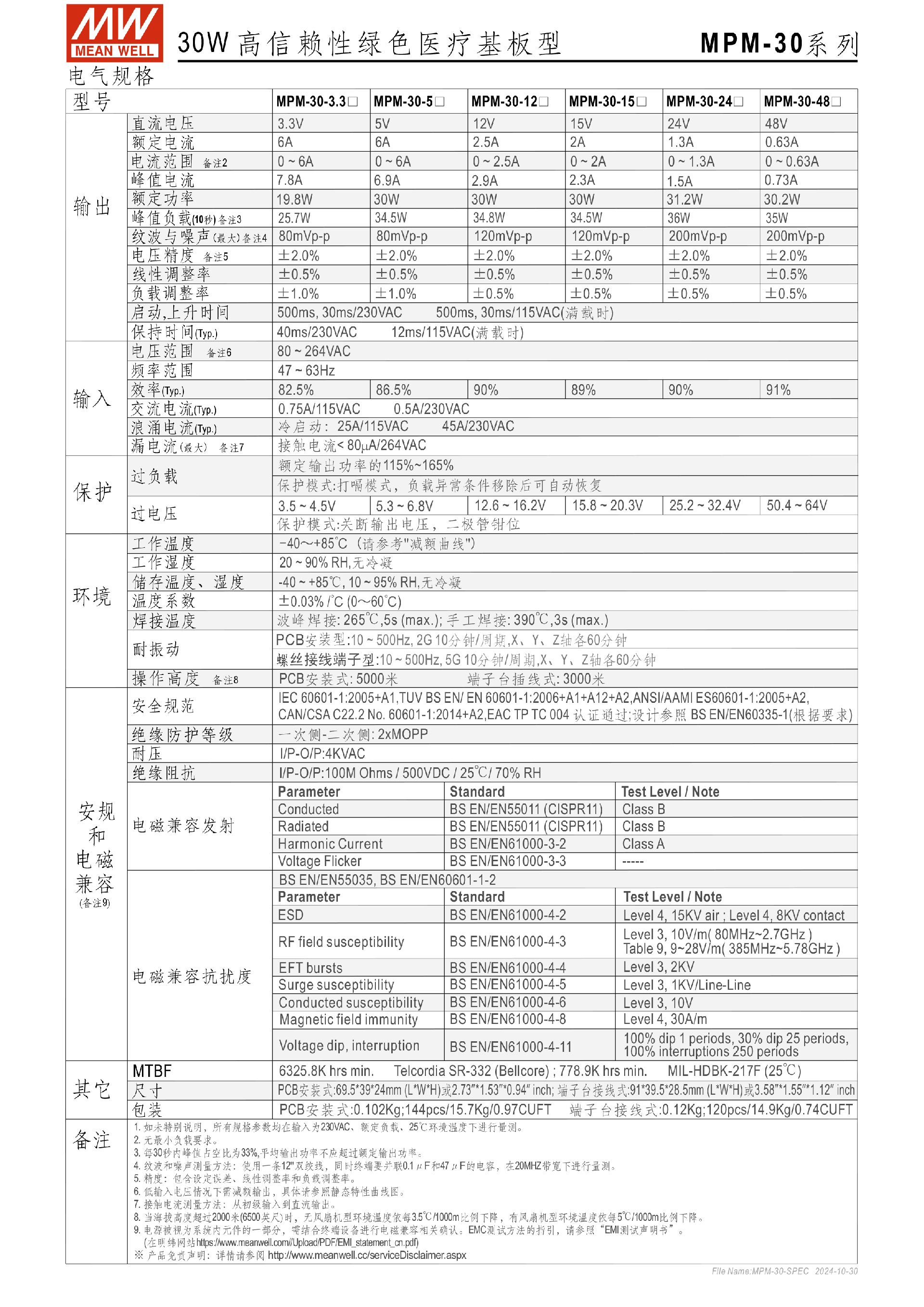 臺灣明緯MPM-30系列醫(yī)療封閉型電源-醫(yī)療用 - 基板型-東莞市誠緯實業(yè)有限公司-
