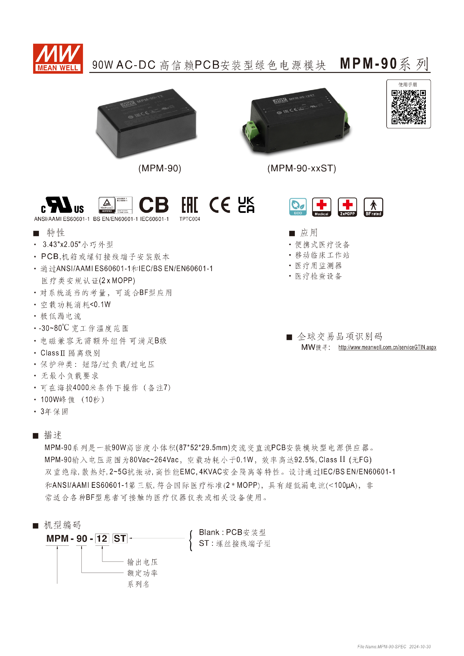 臺(tái)灣明緯MPM-30系列醫(yī)療封閉型電源