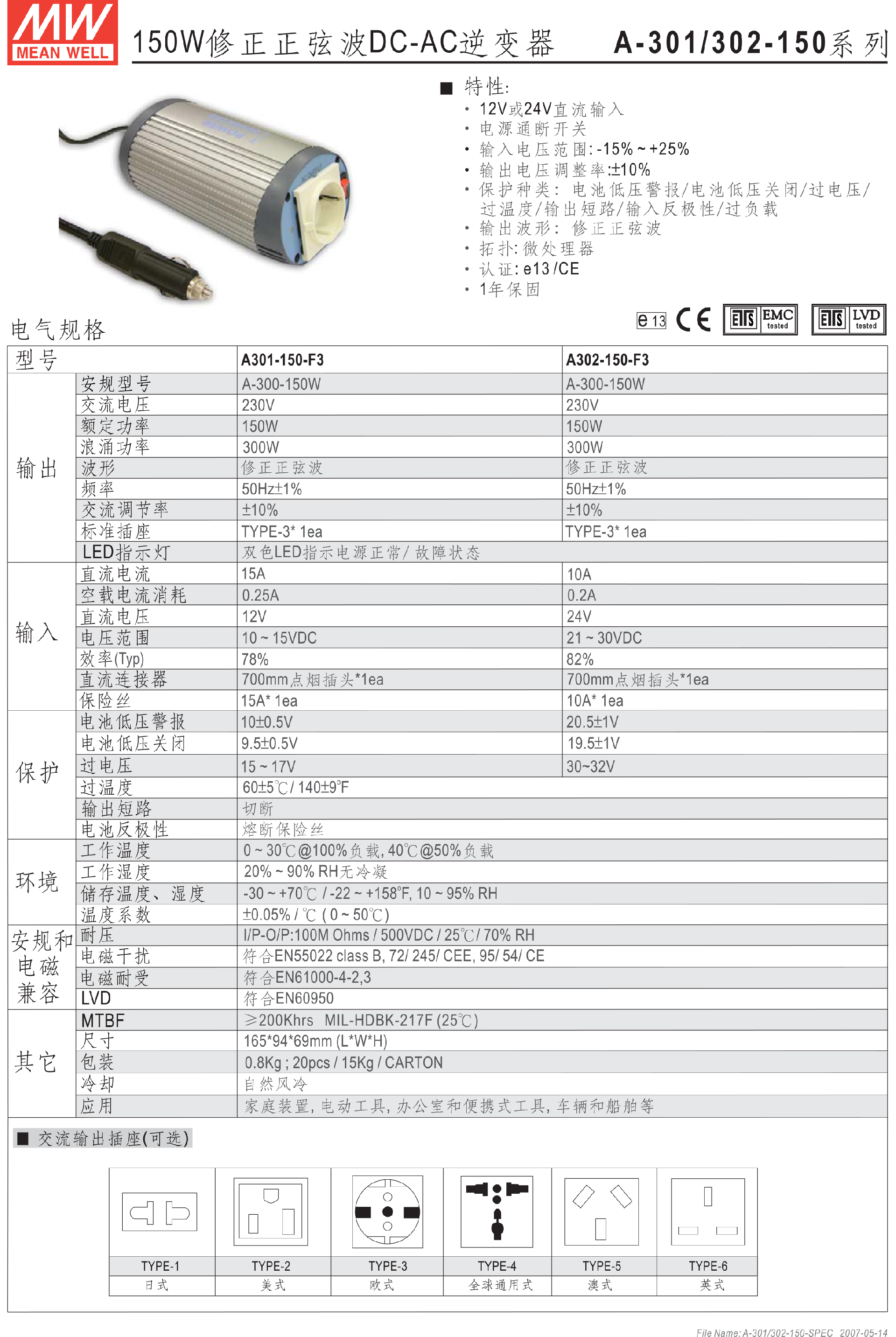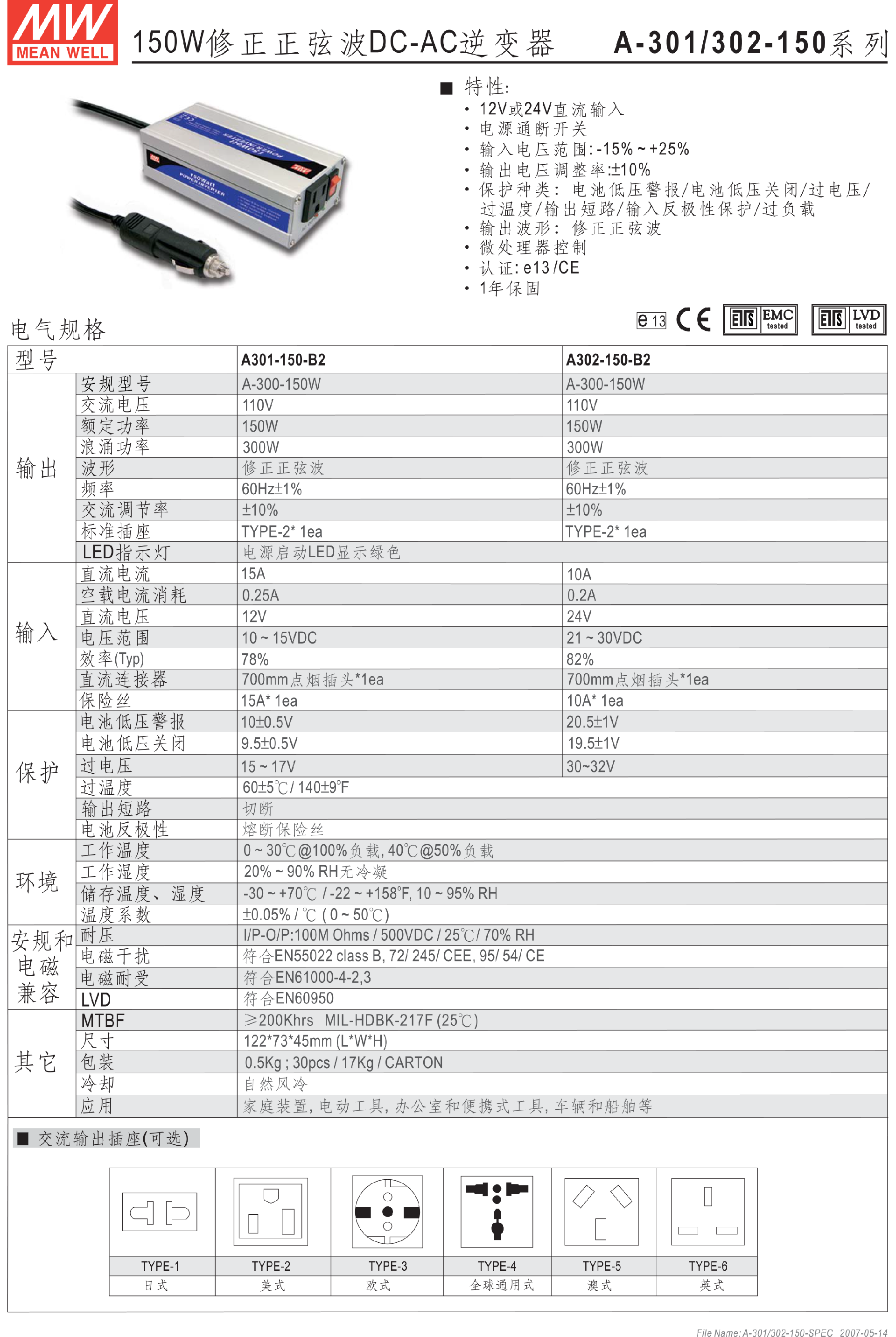 臺灣明緯300W修正正弦波DC-AC逆變器A301-300-B2