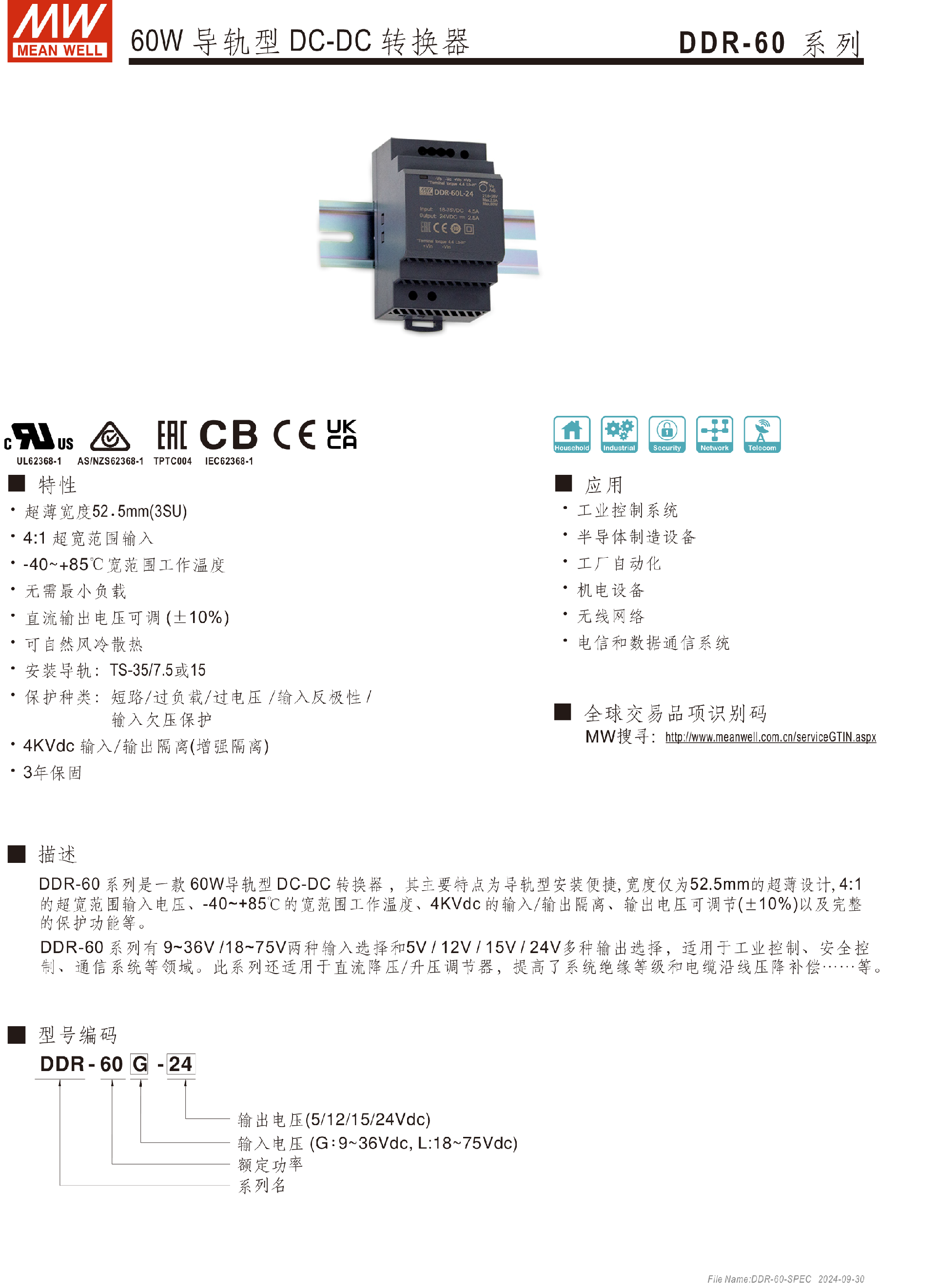 明緯電源DDR-120系列120W導(dǎo)軌型DC-DC轉(zhuǎn)換器