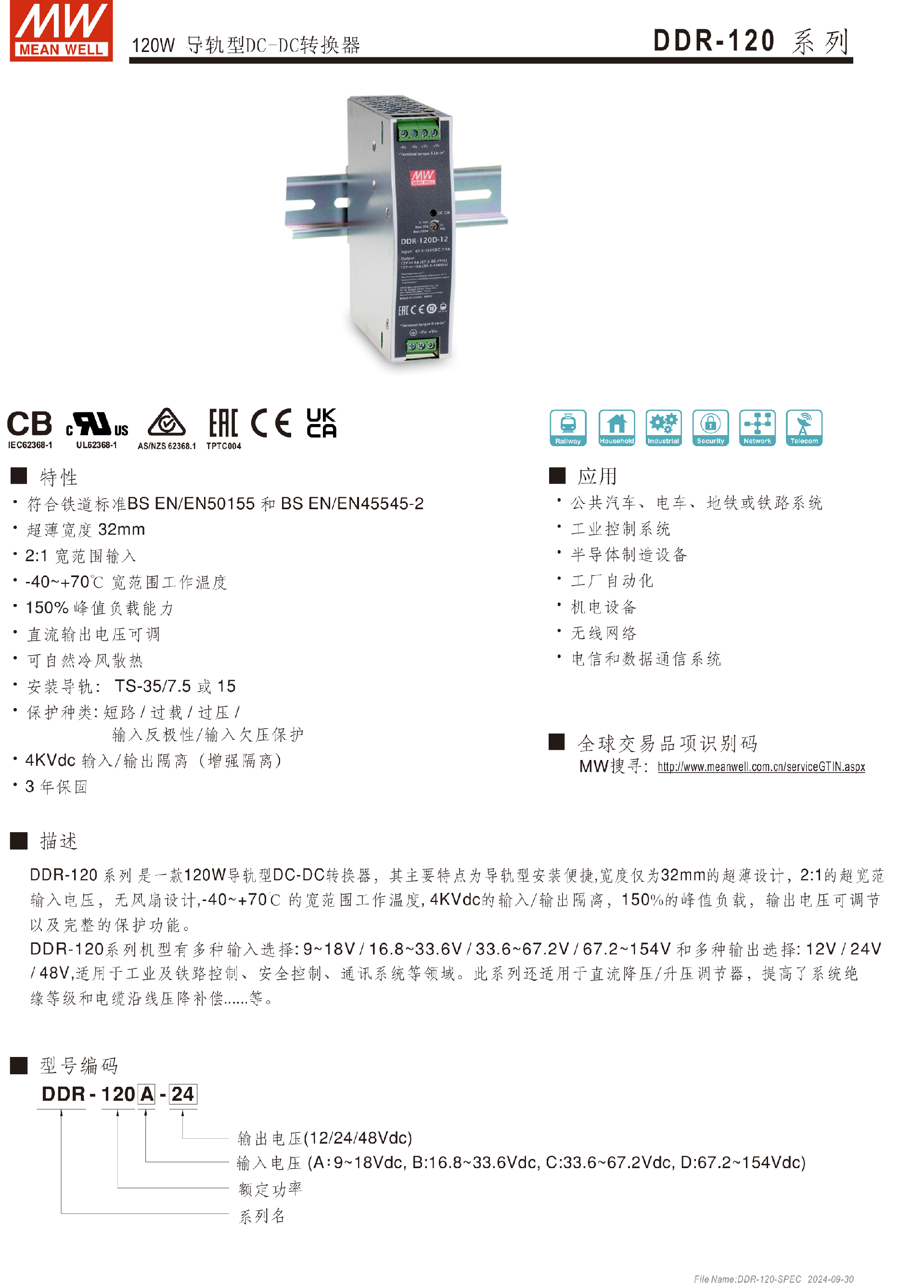 明緯電源DDR-240系列240W導(dǎo)軌型DC-DC轉(zhuǎn)換器