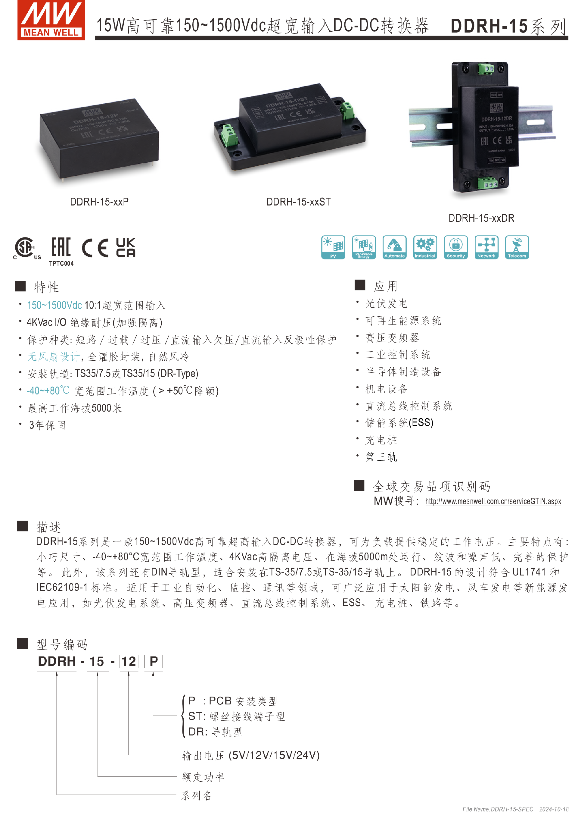 明緯電源DDRH-120系列250~1500Vdc超寬輸入DC-DC轉(zhuǎn)換器