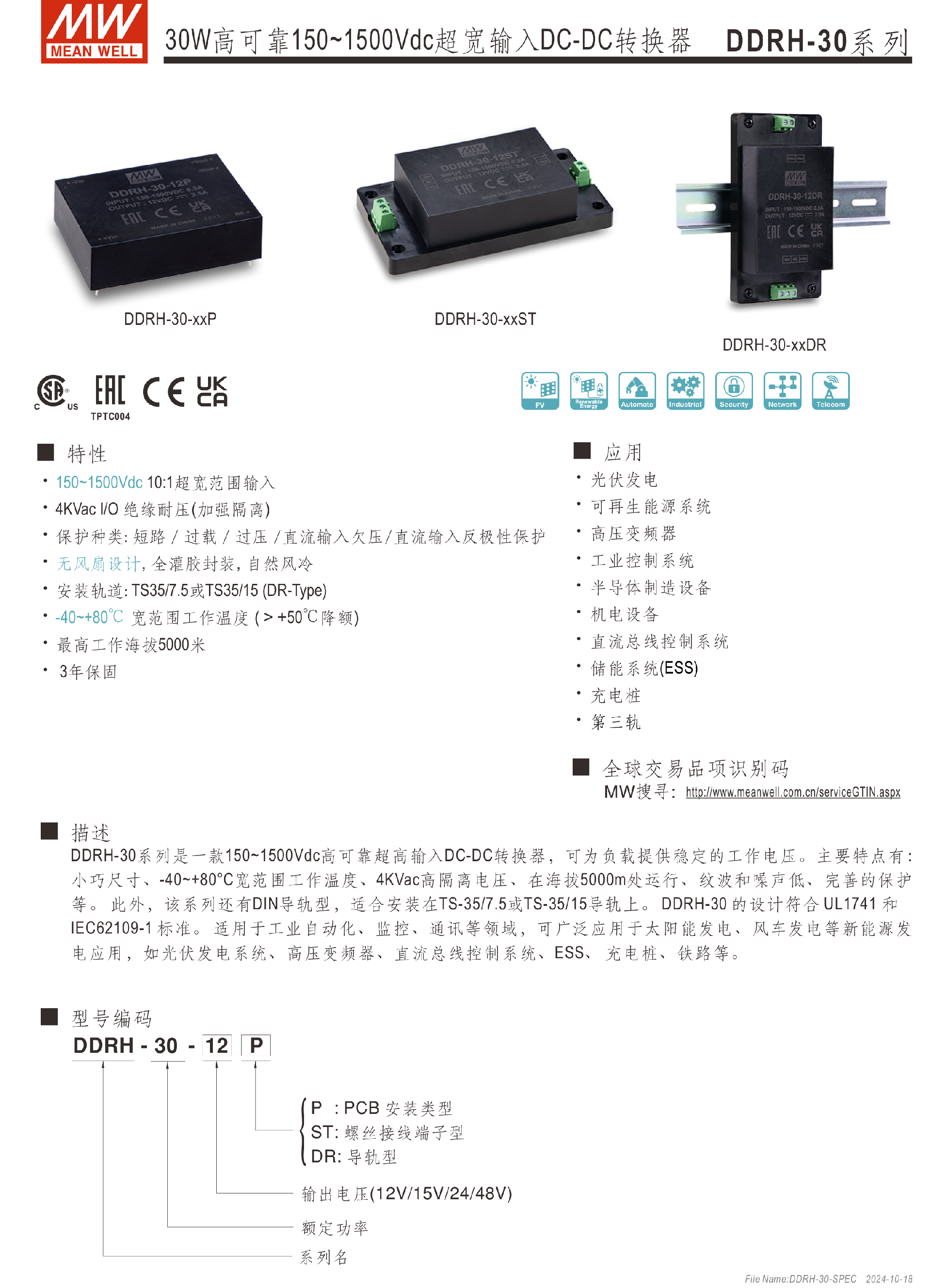 明緯電源DDRH-15系列150~1500Vdc超寬輸入DC-DC轉(zhuǎn)換器