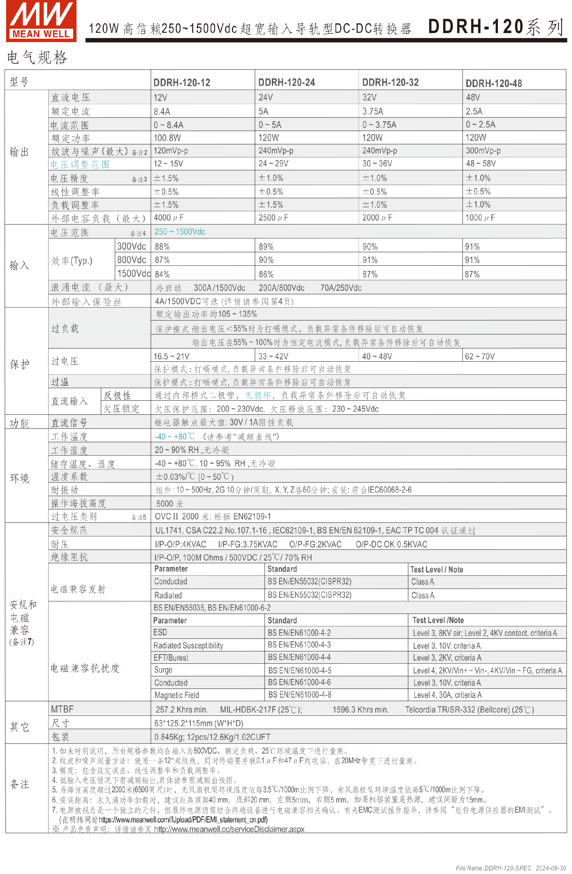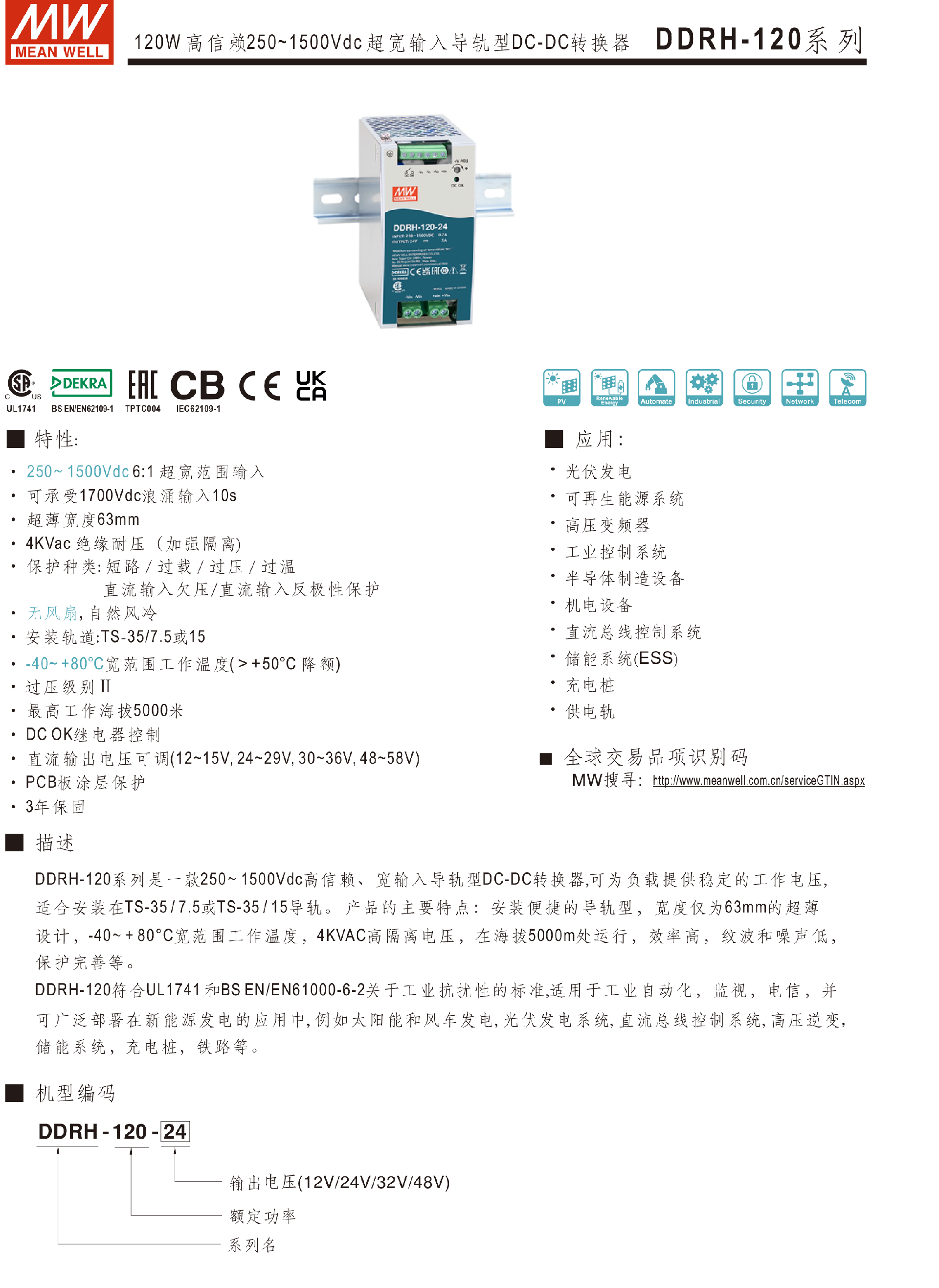 明緯電源DDRH-120系列250~1500Vdc超寬輸入DC-DC轉換器-DDRH系列—光伏再生能源-東莞市誠緯實業(yè)有限公司-