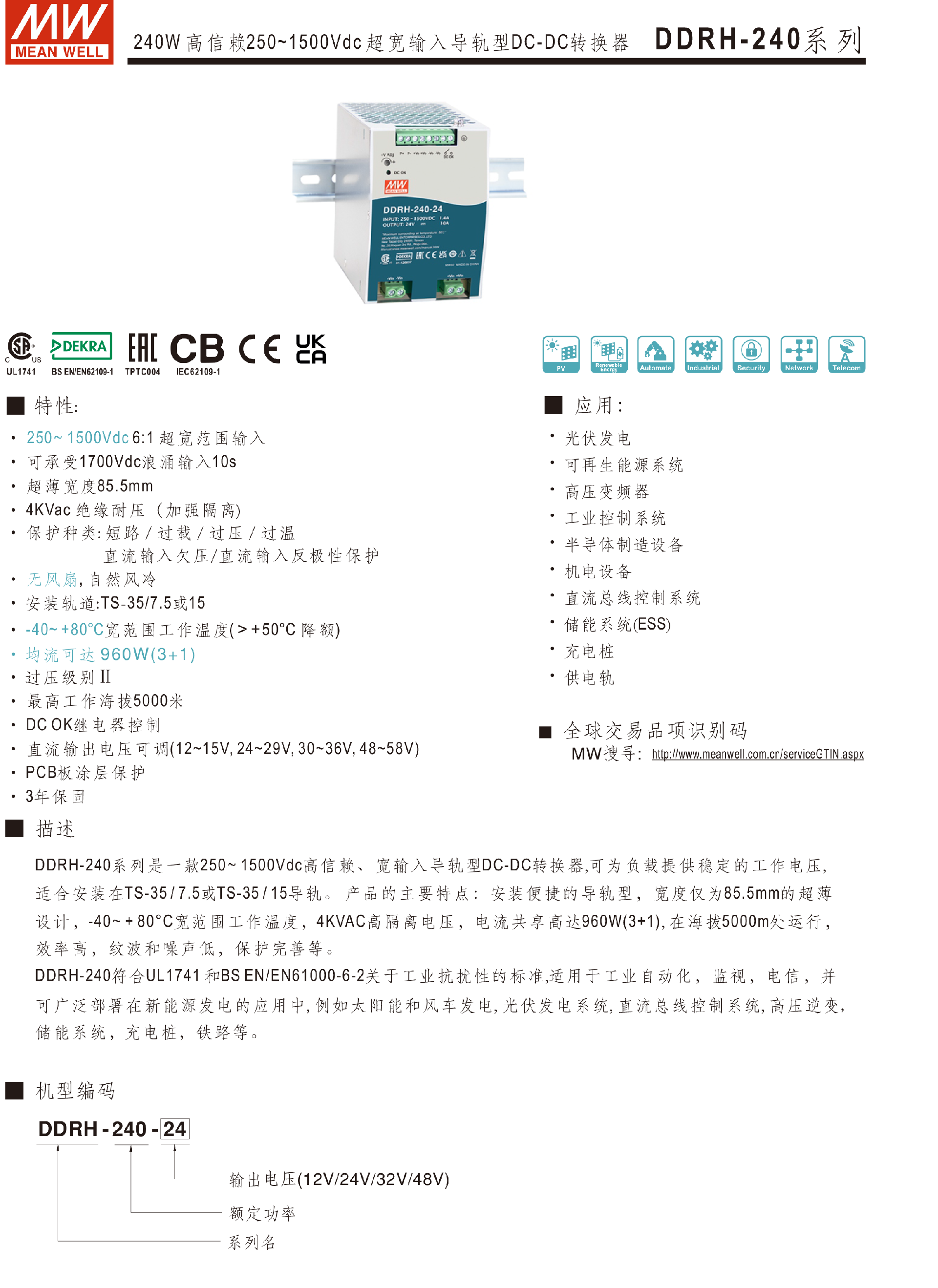 明緯電源DDRH-240系列250~1500Vdc超寬輸入DC-DC轉(zhuǎn)換器-DDRH系列—光伏再生能源-東莞市誠緯實業(yè)有限公司-