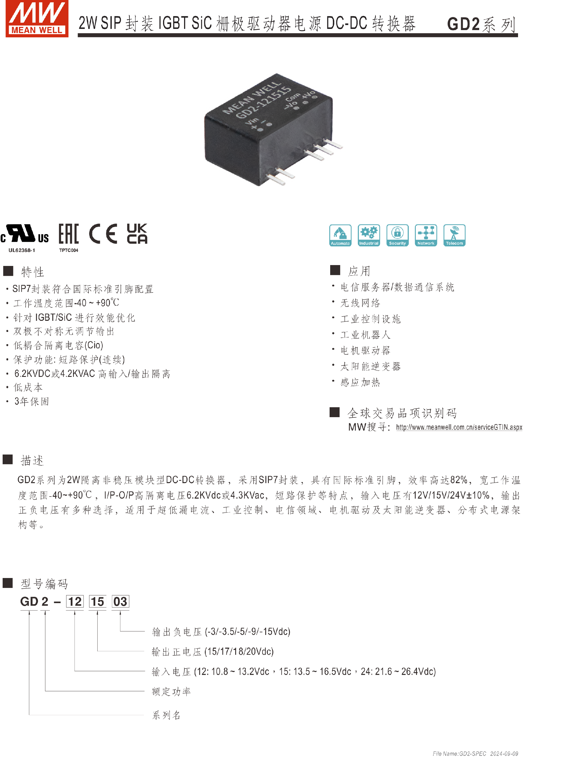 明緯電源GD2系列2W SIP封裝IGBT SiC柵極驅動器電源DC-DC轉換器-SIP系列-東莞市誠緯實業(yè)有限公司-