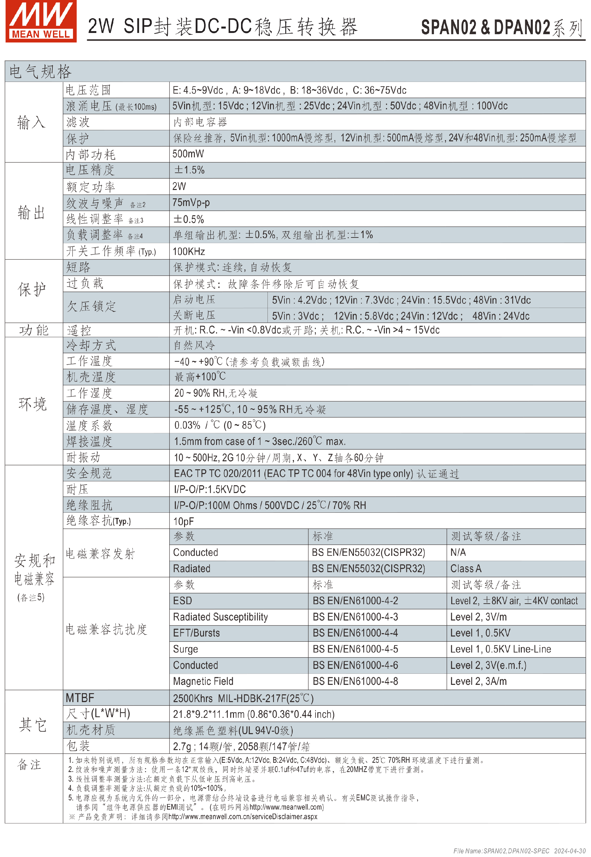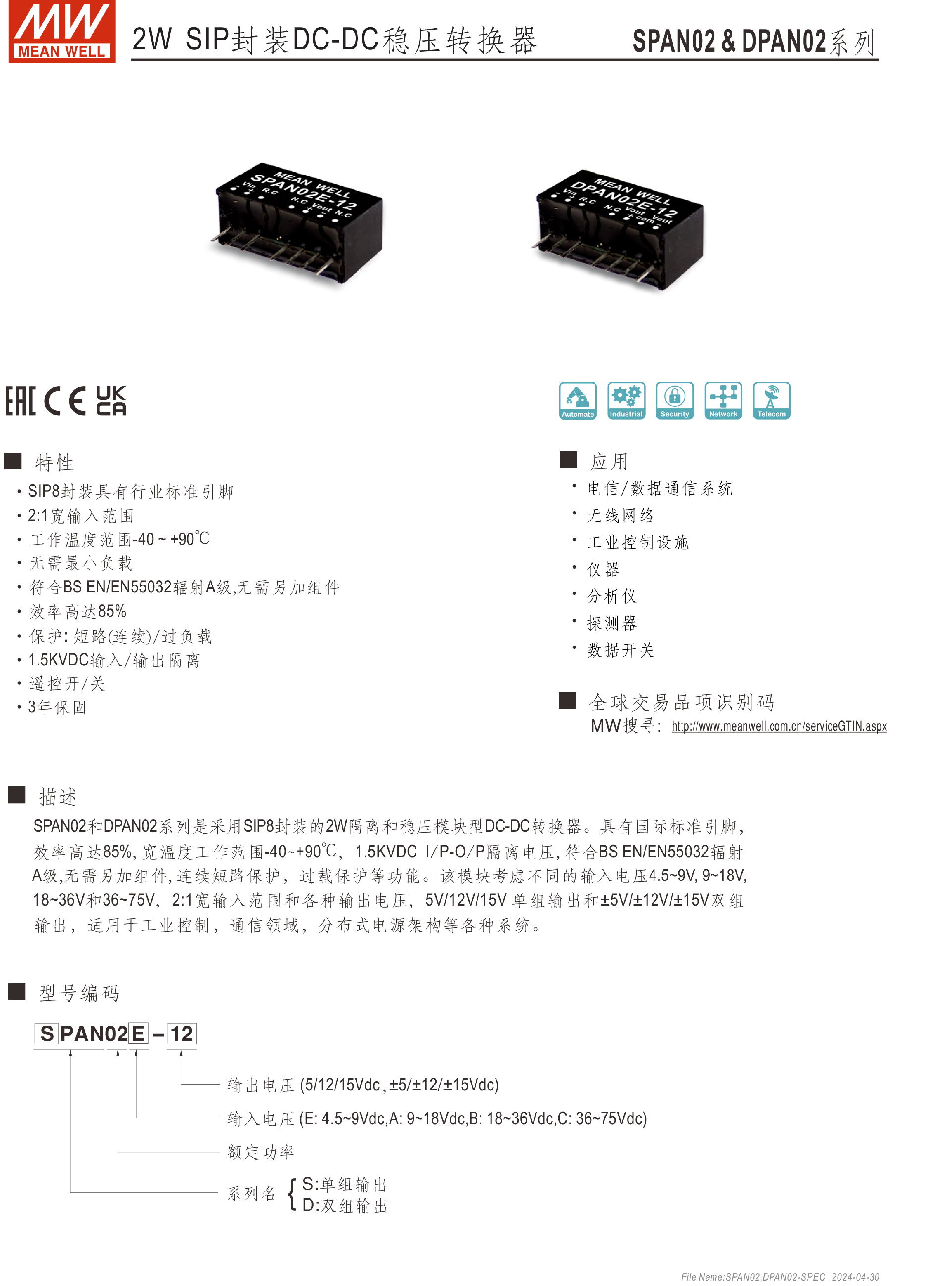 明緯電源SPA01系列1W DC-DC穩(wěn)壓單組輸出變換器