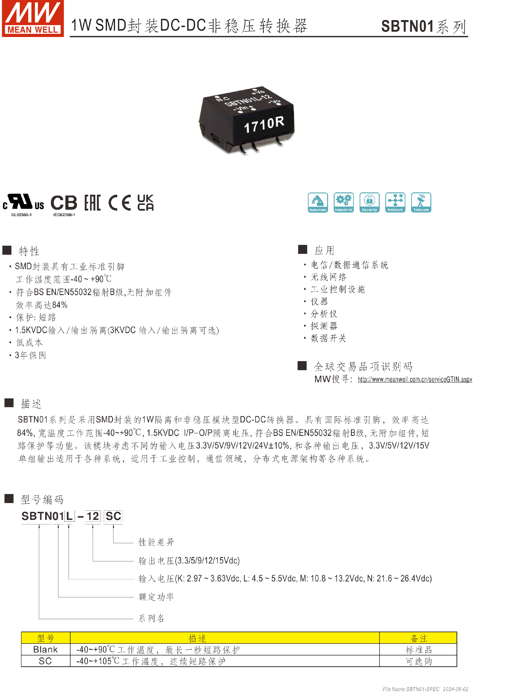 明緯電源SBTN01-N系列1W SMD封裝DC-DC非穩(wěn)壓轉(zhuǎn)換器