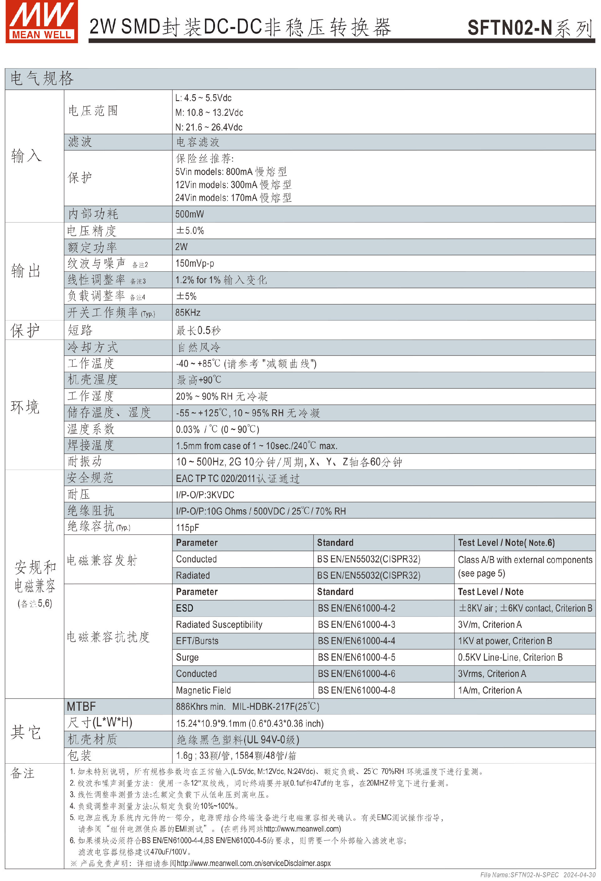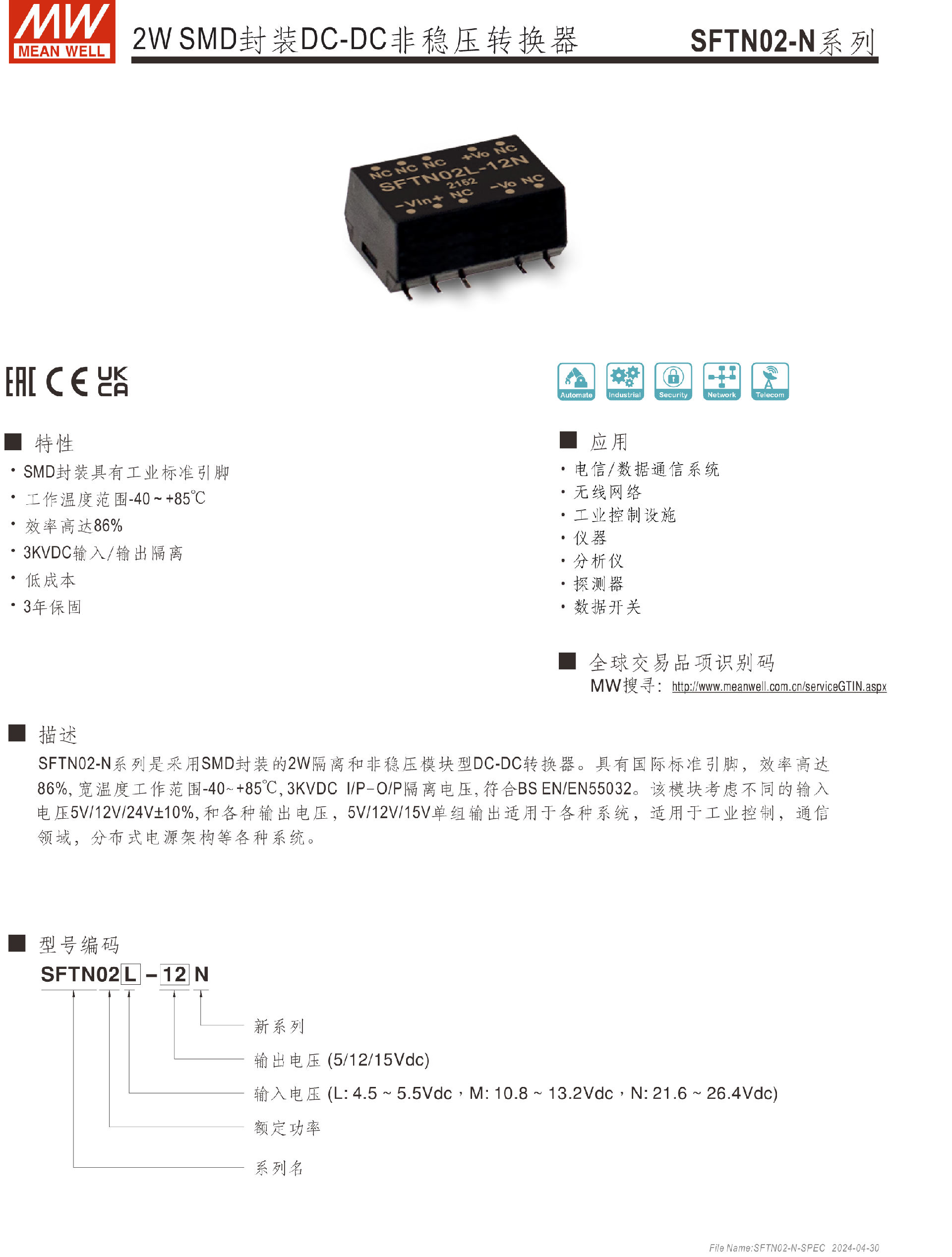 明緯電源SFTN02系列2W SMD封裝DC-DC非穩(wěn)壓轉(zhuǎn)換器
