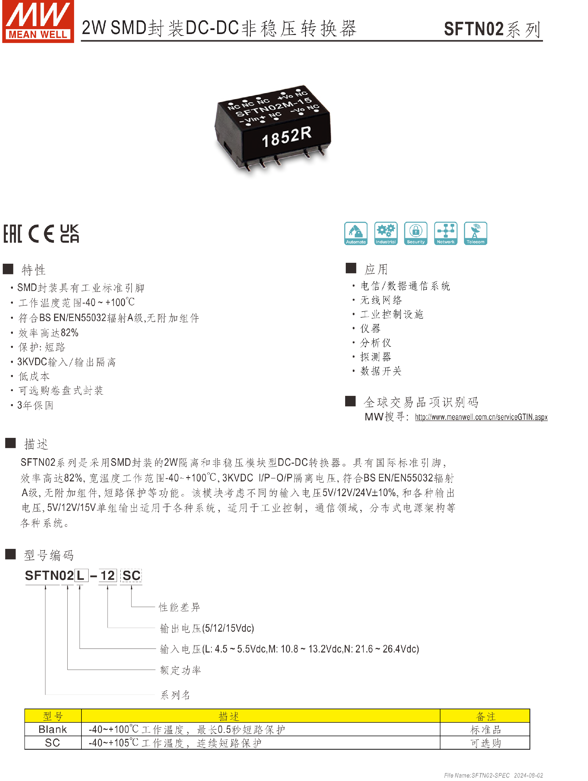 明緯電源SFTN01-N系列1W SMD封裝DC-DC非穩(wěn)壓轉(zhuǎn)換器