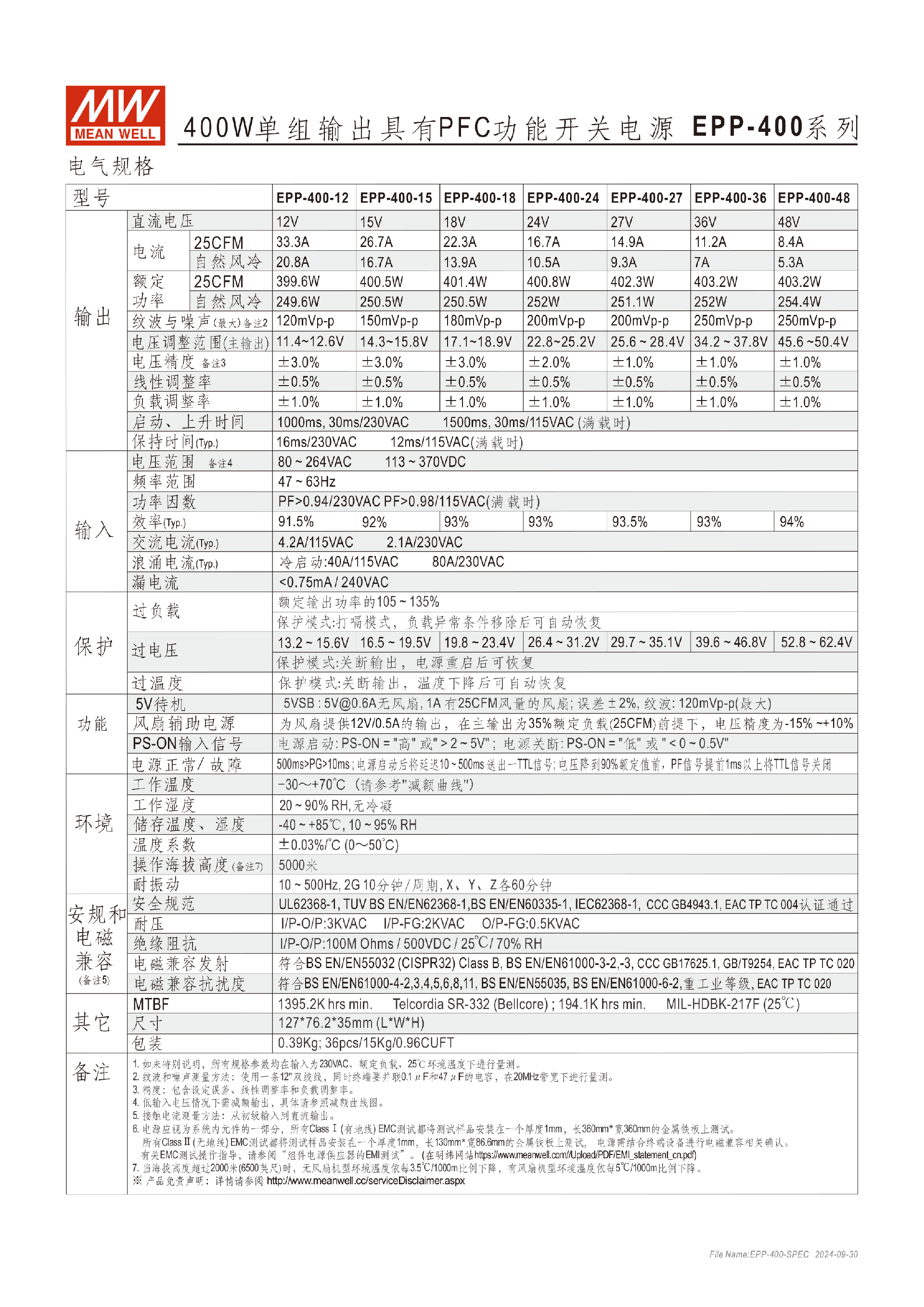 臺灣明緯EPP-400系列400W單組輸出開關電源