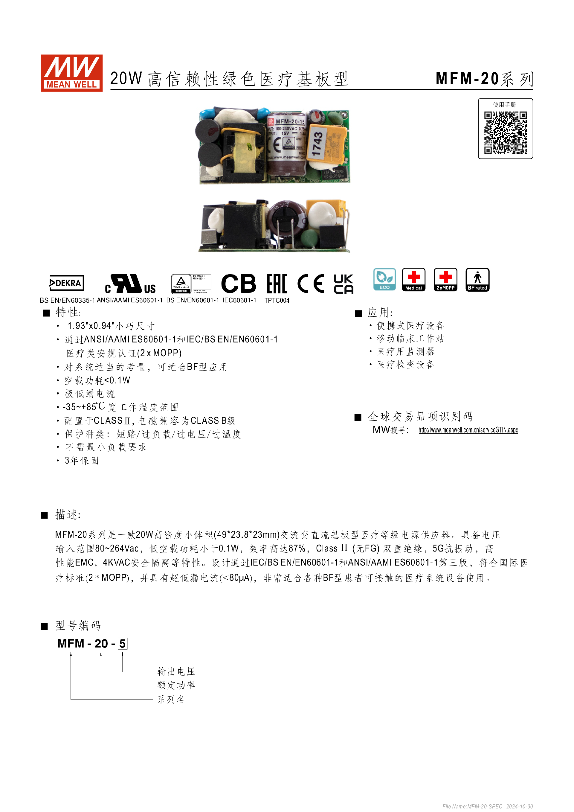 臺灣明緯MFM-20系列醫(yī)療基板型電源-醫(yī)療用-東莞市誠緯實業(yè)有限公司-
