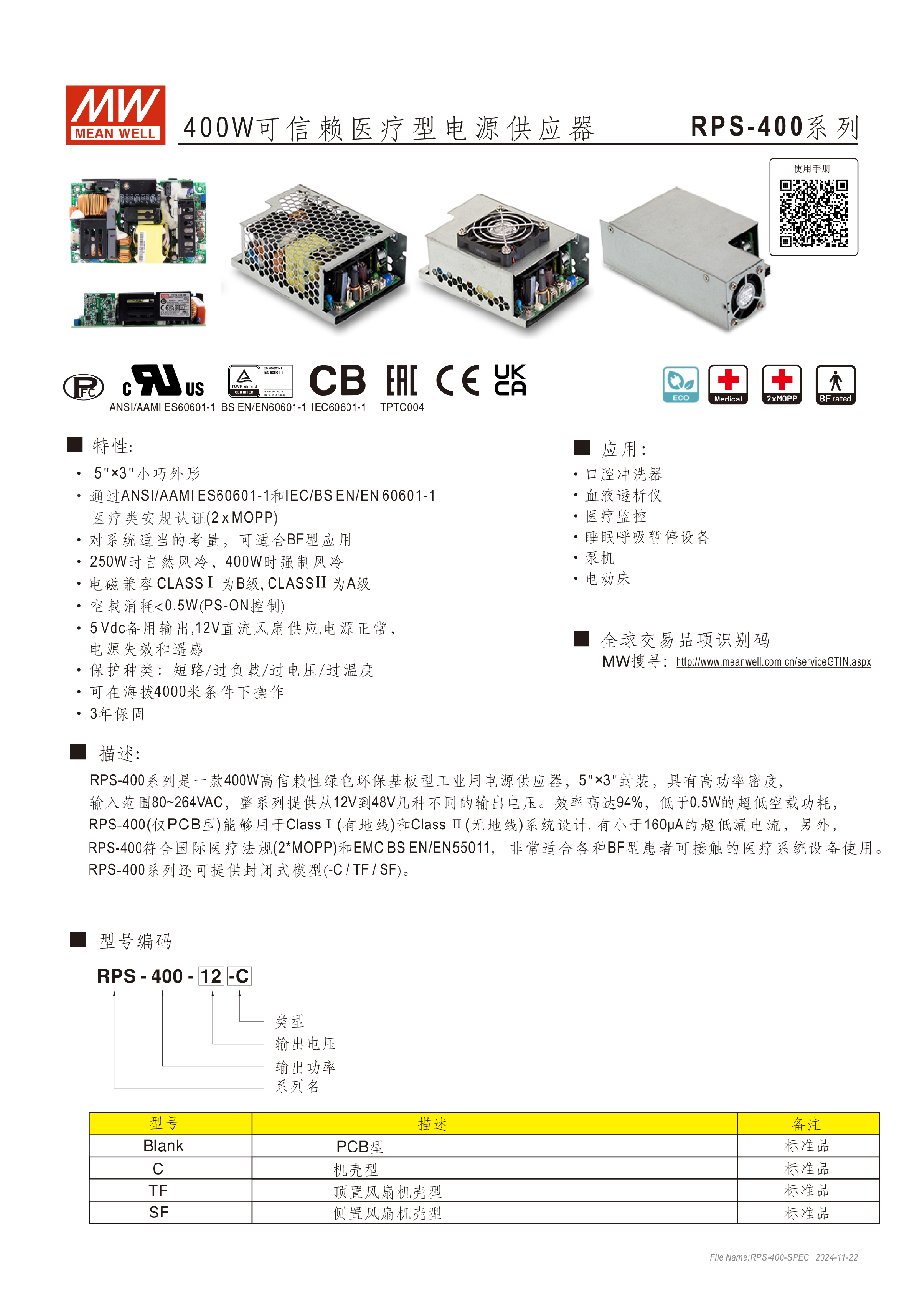 臺灣明緯RPS-300系列300W醫(yī)療電源供應(yīng)器