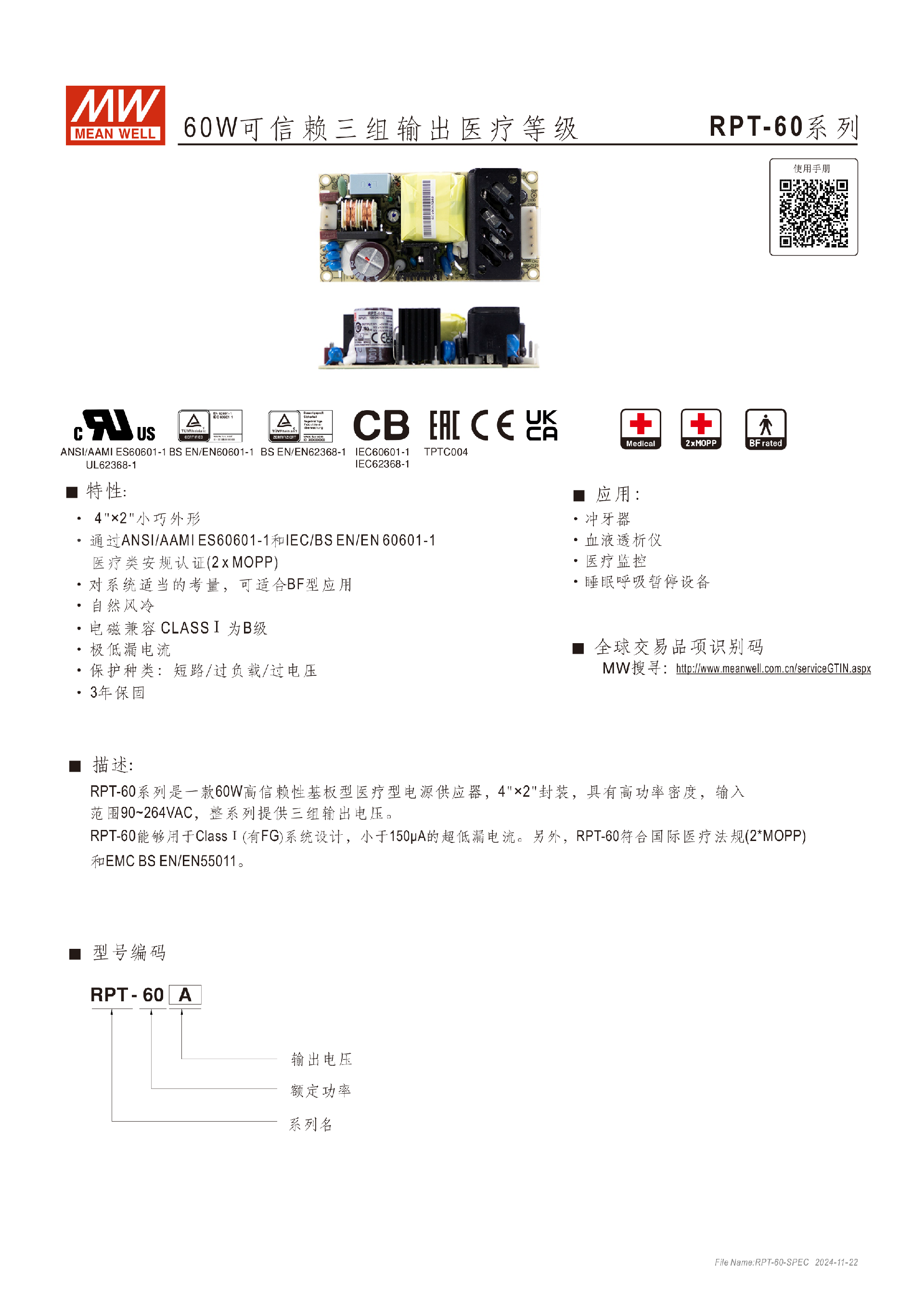 臺(tái)灣明緯MPM-05系列醫(yī)療封閉型電源